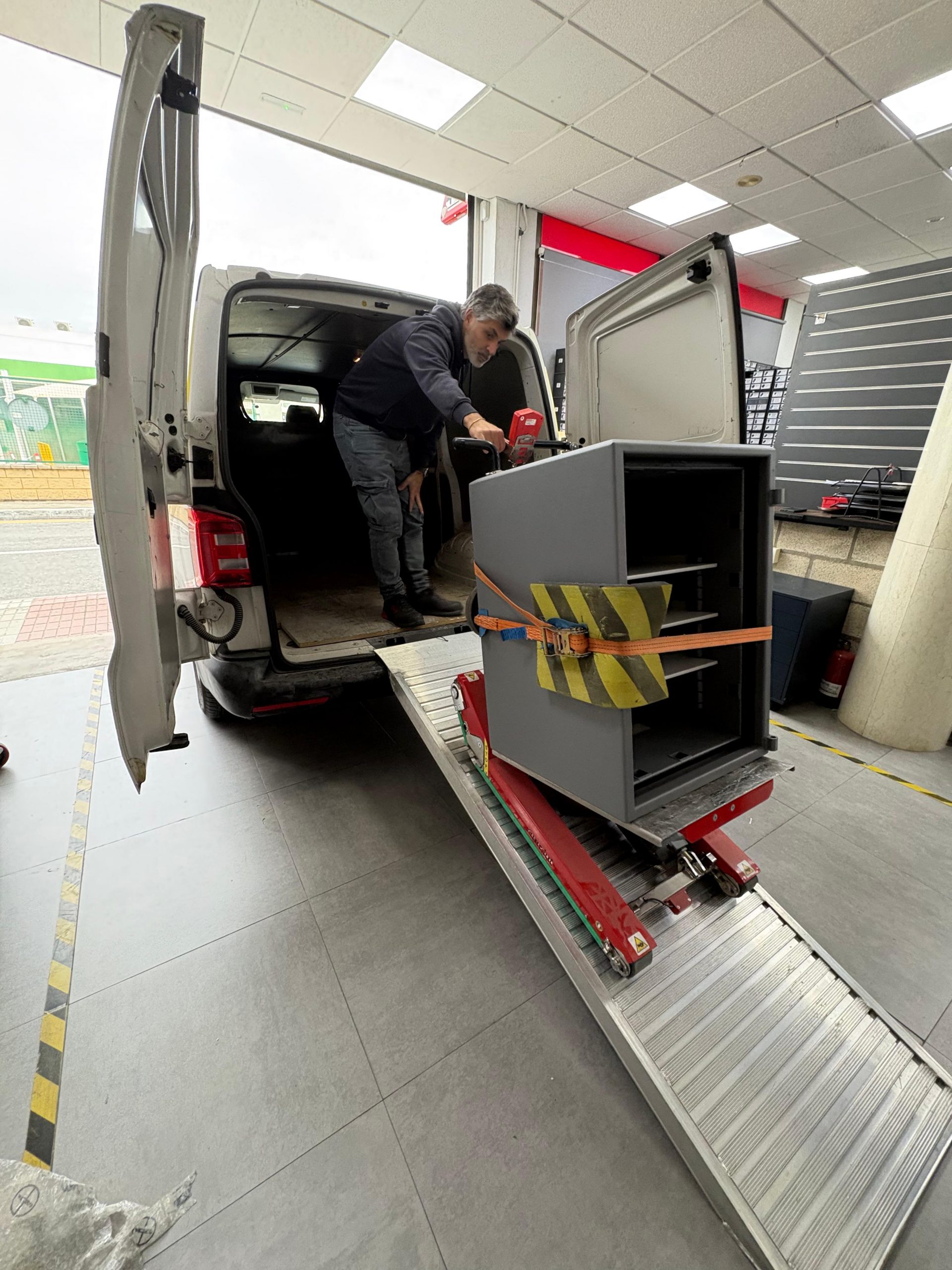 Para garantizar un resultado seguro y sin improvisaciones, contamos con maquinaria propia para el transporte y la instalación: equipos específicos para mover cajas fuertes pesadas, salvar desniveles, acceder a zonas complicadas y colocar la caja fuerte con control y precisión. Nos encargamos de todo el proceso: asesoramiento, entrega, posicionamiento e instalación, minimizando riesgos y protegiendo su propiedad.